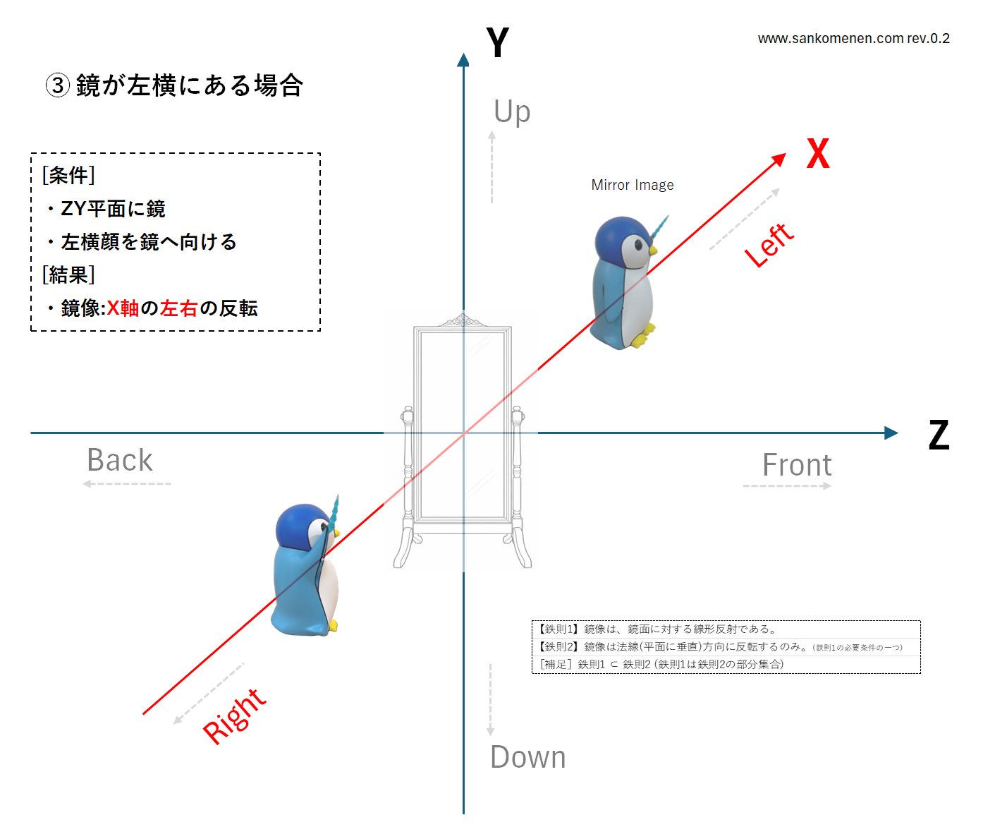 正面の鏡では左右反転はしていない 鏡を正面から見た時、鏡は前後反転※しますが、左右反転はしていません。 しかし一般的には、「鏡は左右反転する、それは鏡像の持つ特徴だから」と人は言います。 それは、「鏡の中にいる人の立場で […]