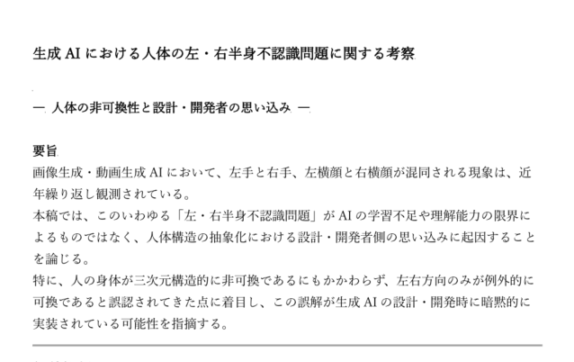― 人体の非可換性と設計・開発者の思い込み ― ※:本記事は、生成AIにおける「左・右半身不認識問題」を、AIの性能限界ではなく設計前提の観点から整理した考察です。 要旨 画像生成・動画生成AIにおいて、左手と右手、左横 […]